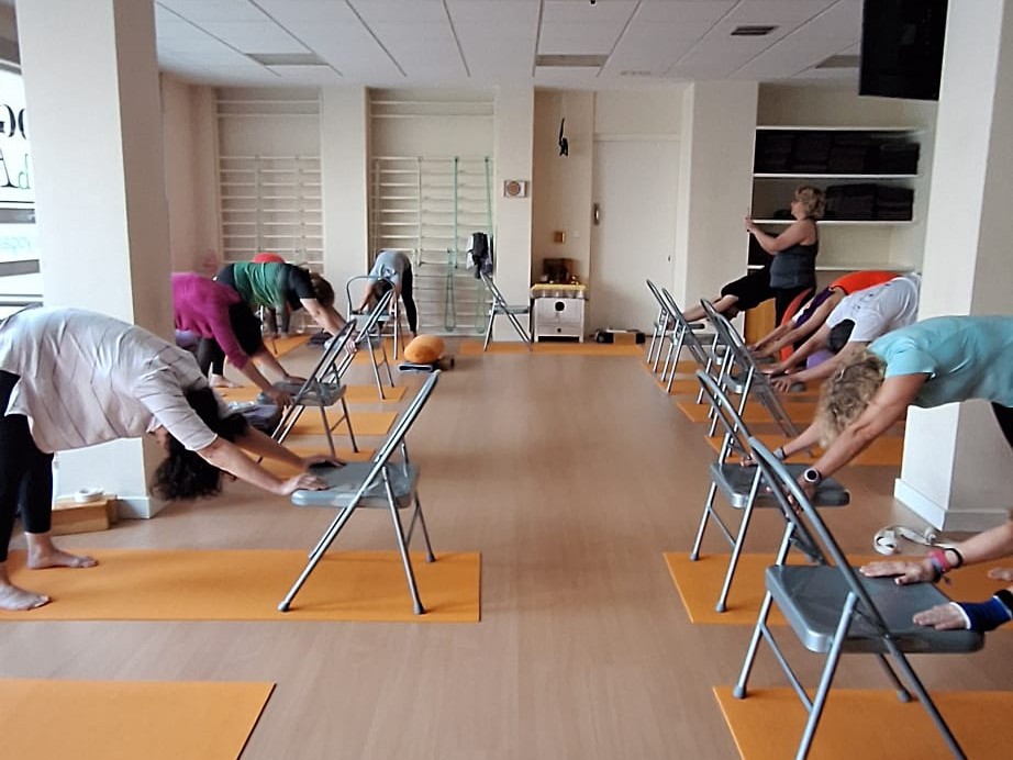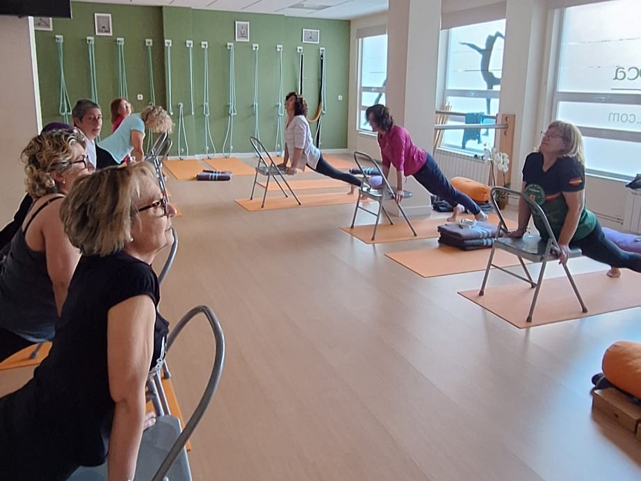 La sesión se desarrolló siguiendo el Método Iyengar, caracterizado por el uso de distintos soportes —mantas, bolsters, bloques, cinturones, cuerdas y sillas— que permiten adaptar cada ejercicio a las necesidades individuales. Este enfoque facilitó que todas las participantes pudieran realizar la práctica de forma segura y personalizada.